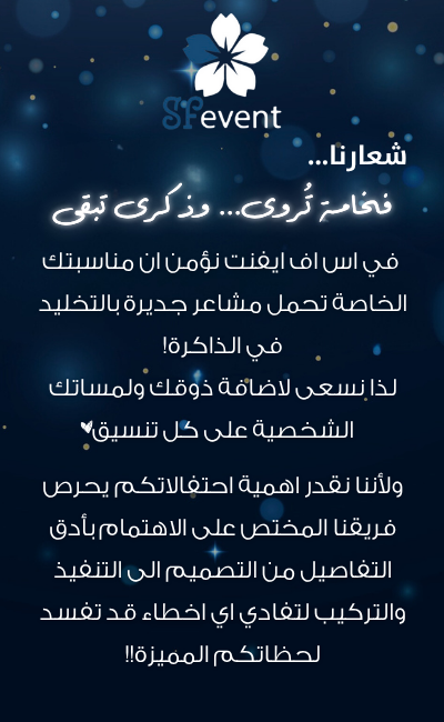 من خلال اقسامنا المتنوعة نستطيع تنسيق مناسبتك اي كانت بالكامل من الديكور الى الاكسسوارت والتوزيعات